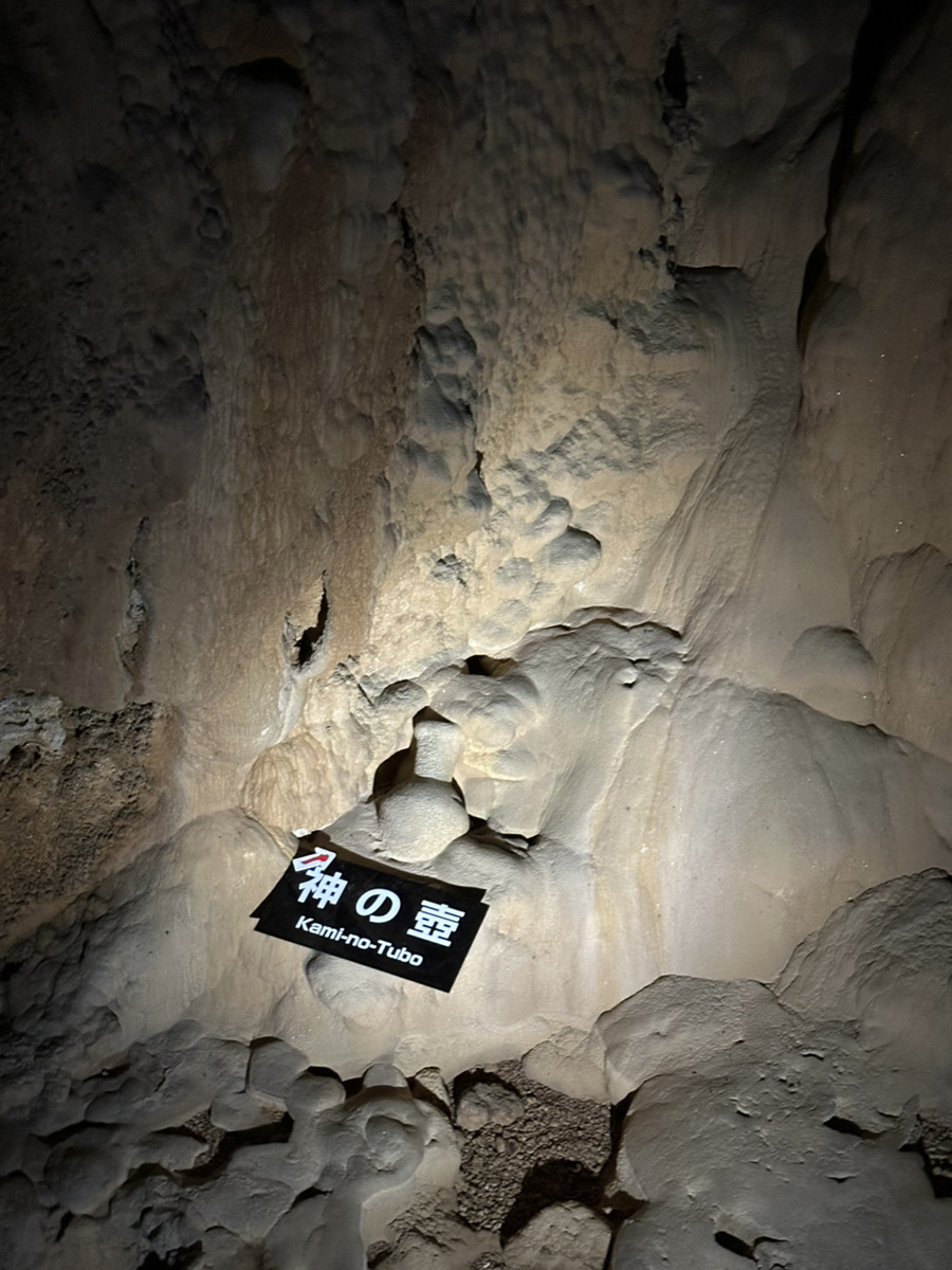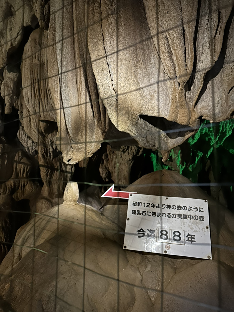 そこを少し先に進むと、神の壺を真似て、壺が鍾乳石に包まれるかどうかの実験をされていて、今年で88年目とのこと。底の方が少し包まれているようですが、本当に一体化するまでにはまだもう少し(かなり?!)かかりそうです。